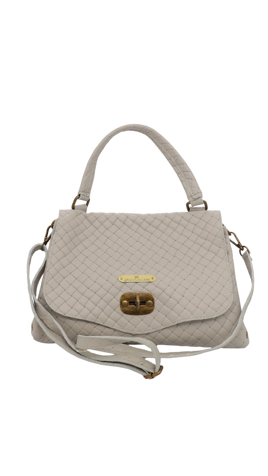 Questa elegante flap bag Midori realizzata in vera pelle intrecciata è perfetta per aggiungere un tocco di stile al tuo outfit. Grazie alla sua resistenza e qualità, sarà la compagna perfetta per il lavoro o per una serata fuori. Aggiungi un tocco di eleganza alla tua collezione con la borsa Midori firmata Rocca Di Capri.