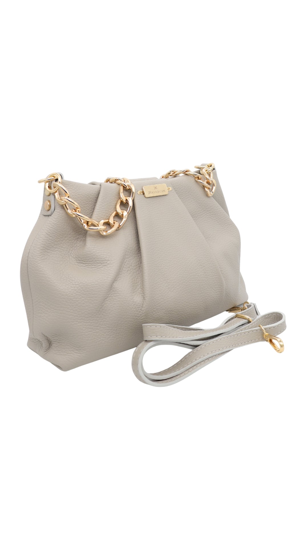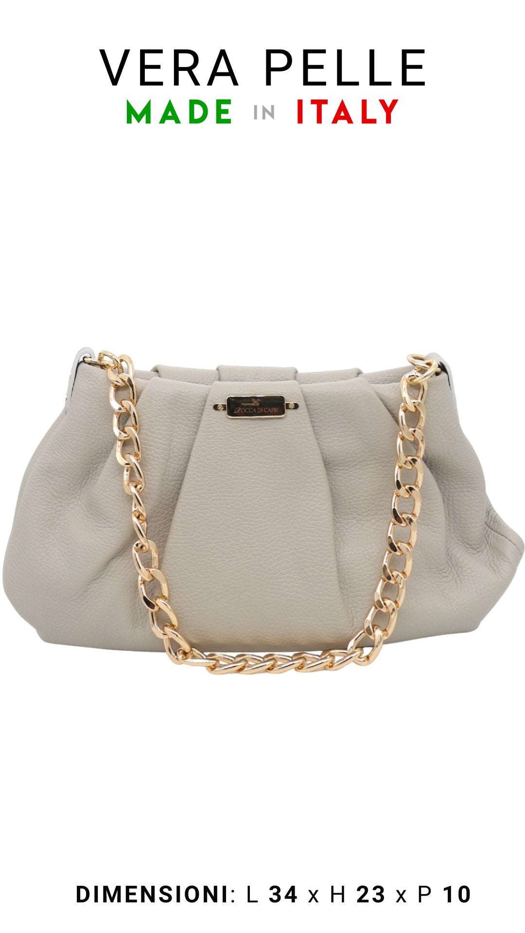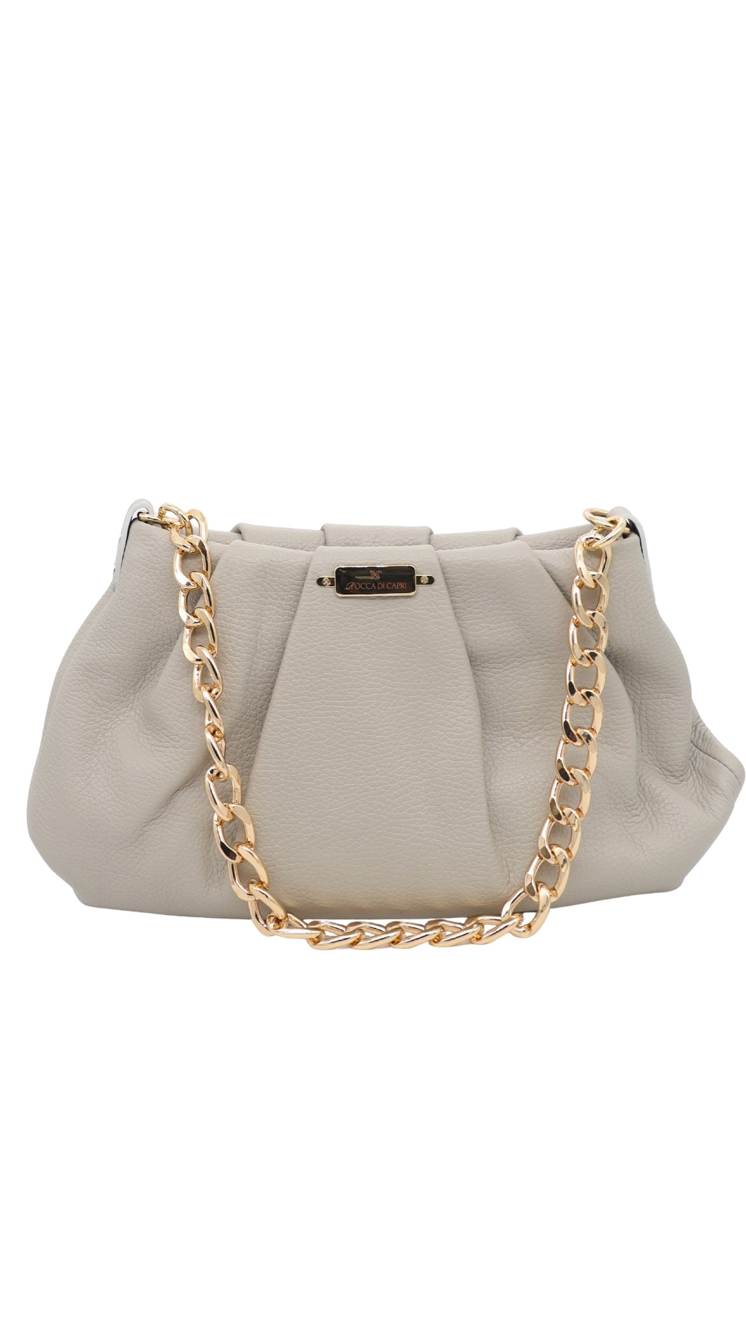 La borsa Tiny in vera pelle morbida con manico a catena color oro è perfetta per un look elegante e sofisticato, è realizzata dagli artigiani Rocca Di Capri in vera pelle morbida che garantisce qualità e comfort. L'ulteriore catena color oro, che permette di portare questa borsa anche a tracolla, aggiunge un tocco chic ai tuoi outfit, rendendo questa bag ideale per ogni occasione.