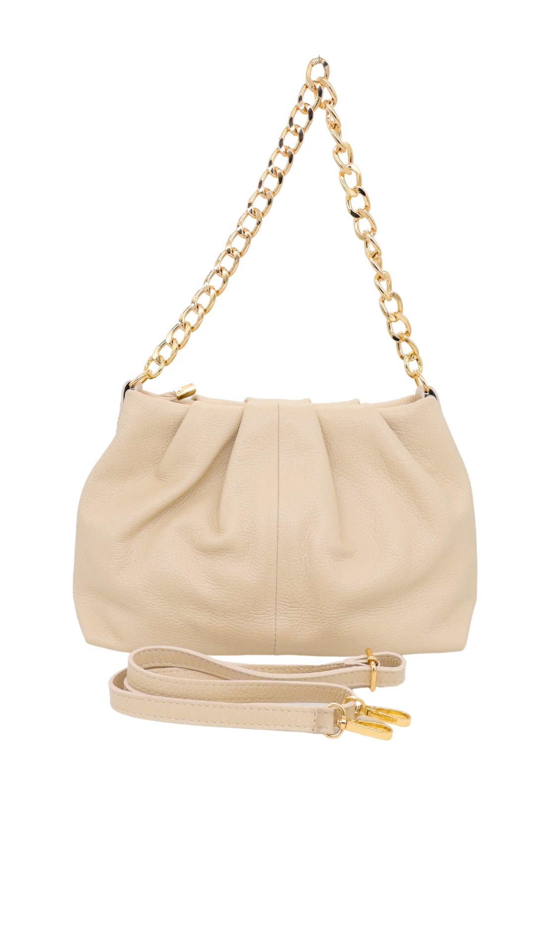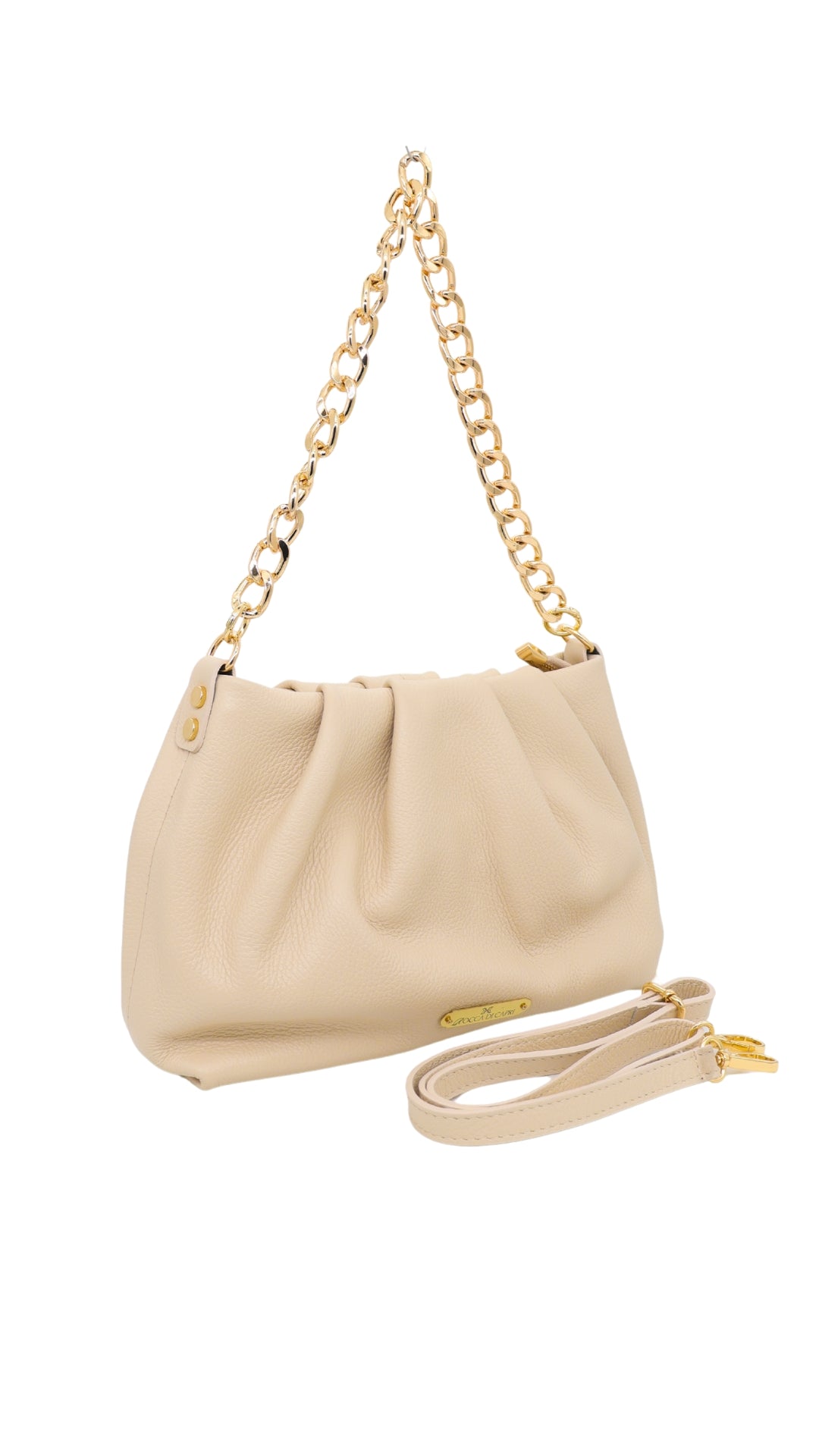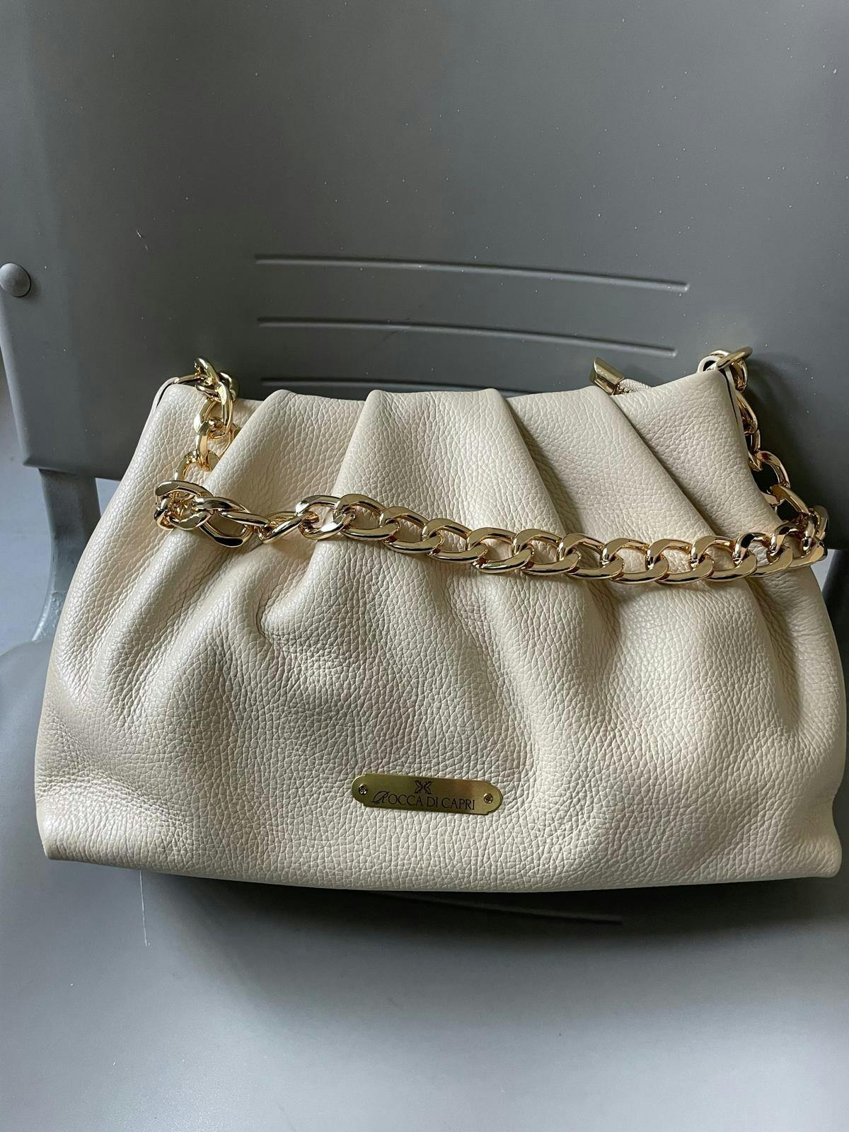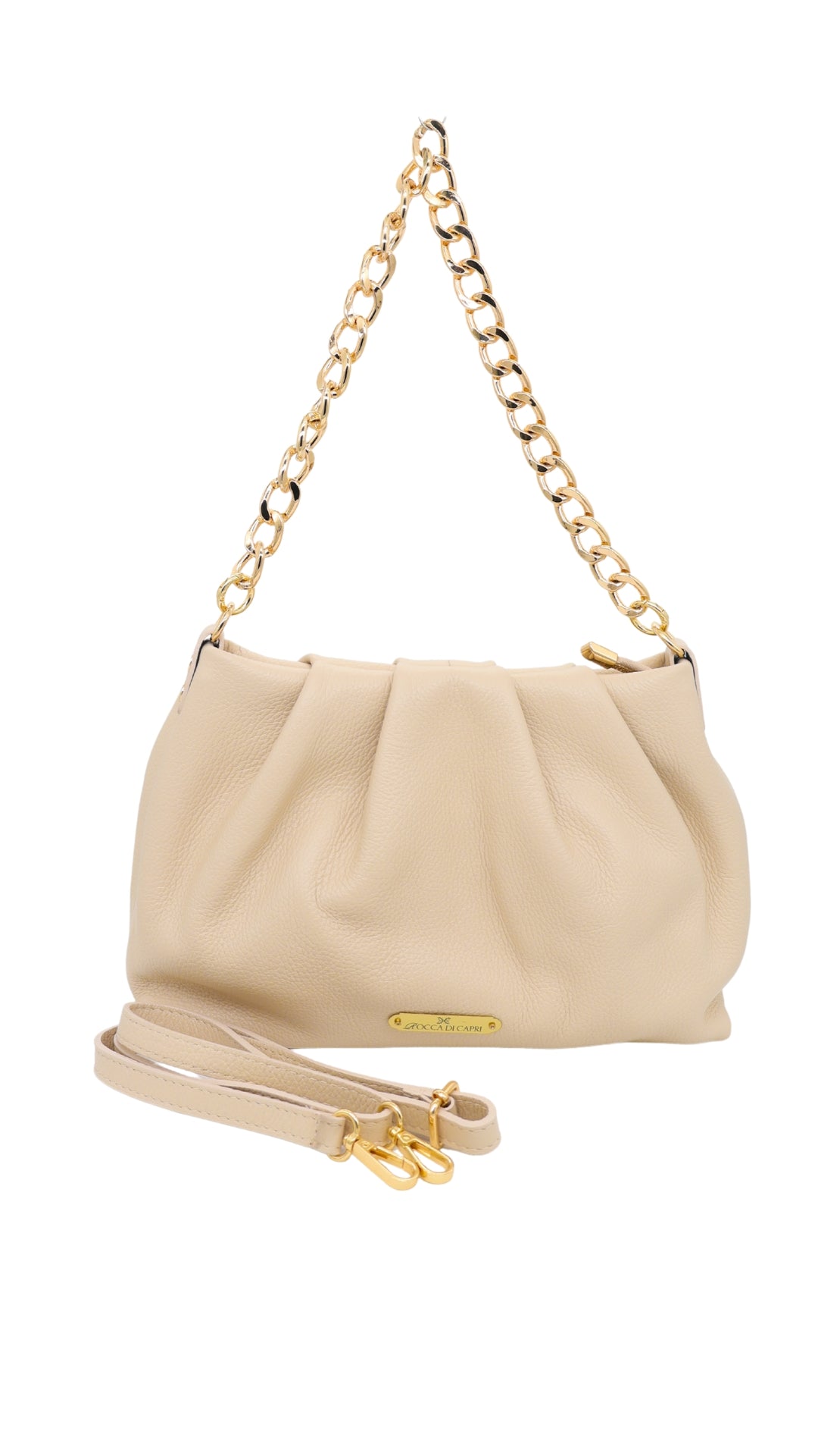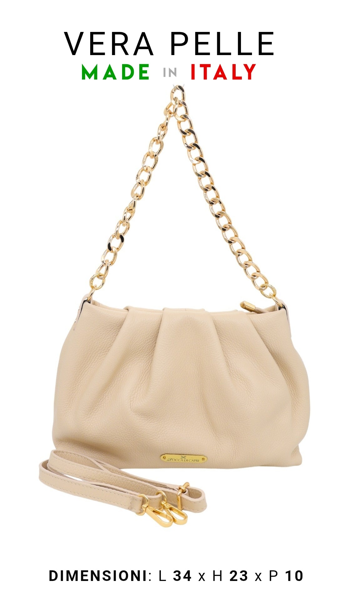 La borsa Tiny in vera pelle morbida con manico a catena color oro è perfetta per un look elegante e sofisticato, è realizzata dagli artigiani Rocca Di Capri in vera pelle morbida che garantisce qualità e comfort. L'ulteriore catena color oro, che permette di portare questa borsa anche a tracolla, aggiunge un tocco chic ai tuoi outfit, rendendo questa bag ideale per ogni occasione.